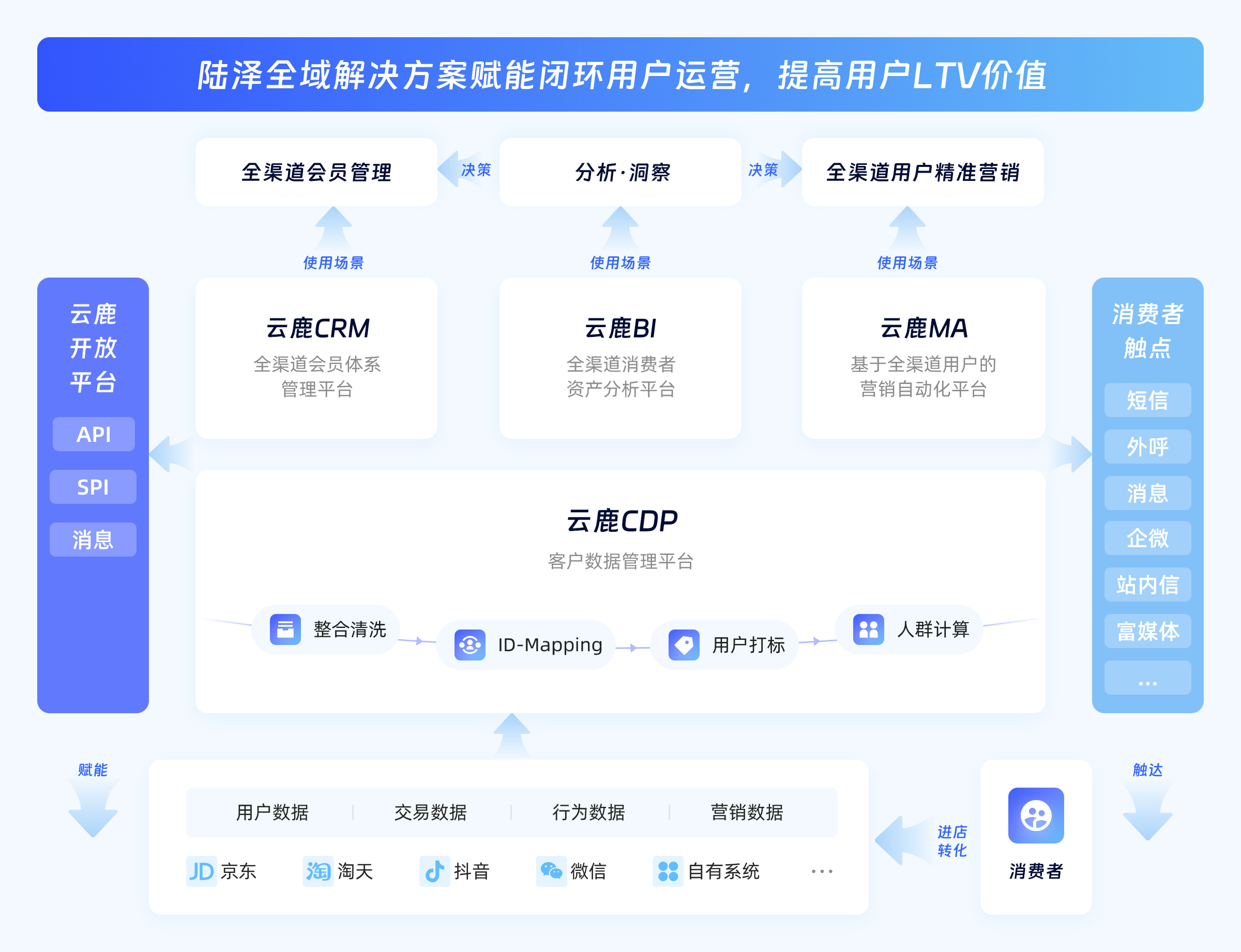 线上线下全渠道消费者运营,通过全域数据与应用深度联动,赋能品牌会员运营闭环及 LTV 增长